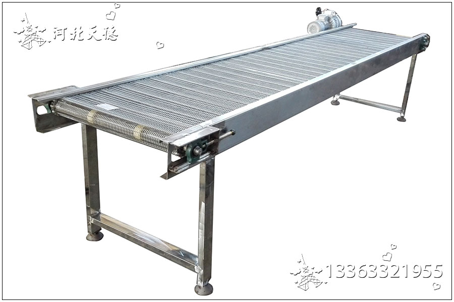 不銹鋼食品網帶輸送機在食品行業當中使用廣泛,非常適用于各類食品行業的烘干、蒸煮、油炸、去濕、等及金屬行業的噴淋、清洗、瀝油及熱處理等工藝。其中還包括用于食品的速凍、烘烤機械的平面輸送、螺旋輸送以及食品機械的清洗、烘干及蒸煮等工藝。 PP食品網帶輸送機通過選用不同型號的PP網帶可以制作成儲瓶臺、提升機、蔬菜清洗機、冷瓶機以及肉食品輸送等行業專用設備考慮網帶承受拉力,單線長度一般不超過20米。