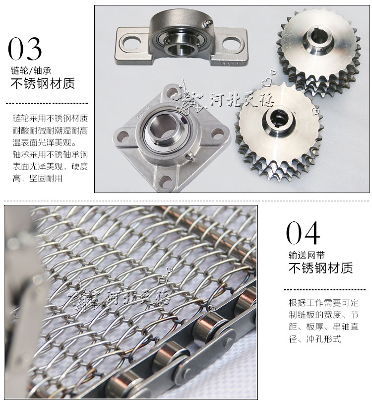 網帶材質: 碳鋼、201不銹鋼、304不銹鋼(某些帶型符合FDA、USDA標準,因此廣泛用于食品加工業。)